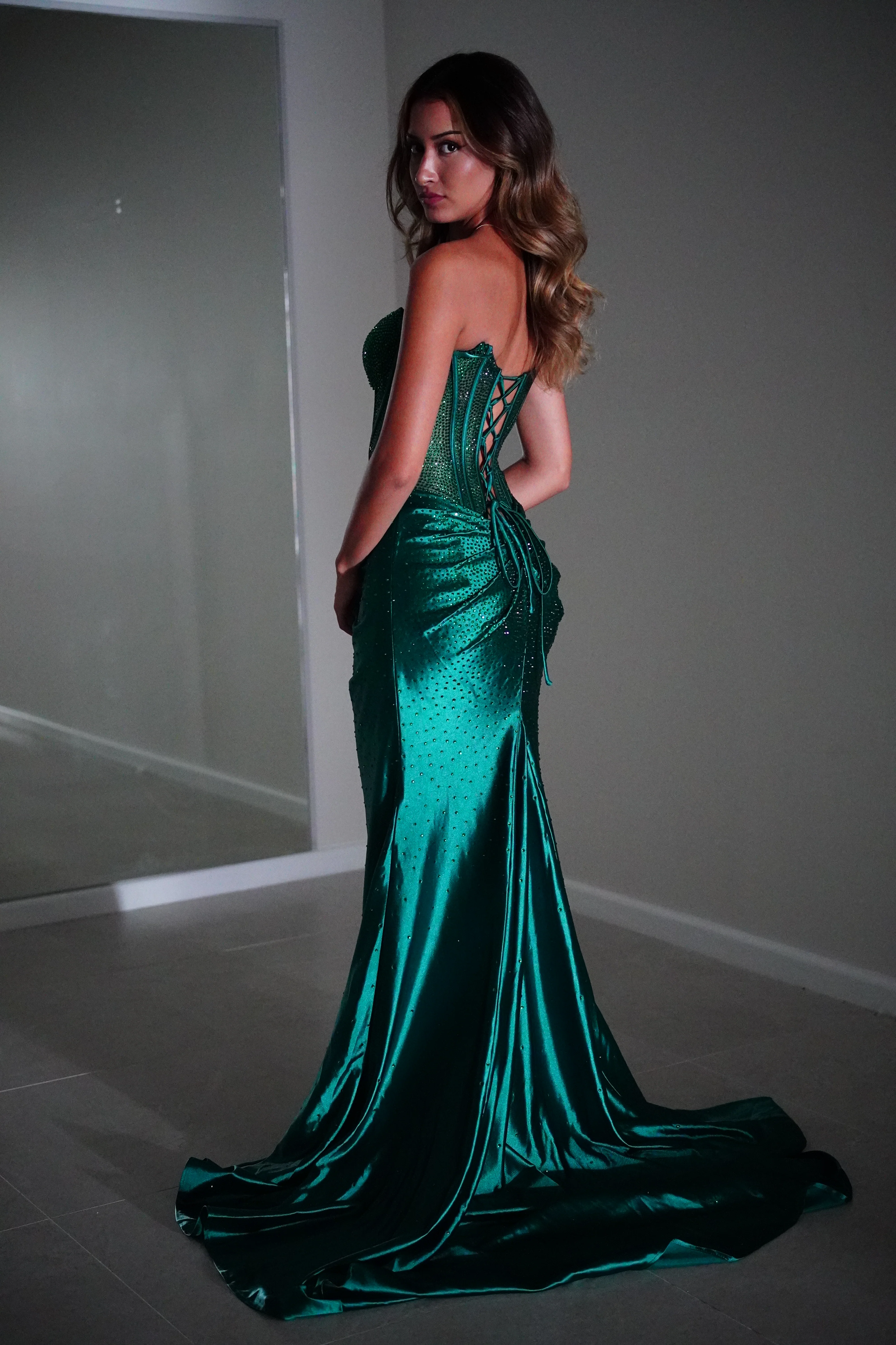 A draped waist detail enhances the figure, while the high leg-slit adds a bold touch of confidence. Finished with a dramatic cathedral-length train, this look was made for red carpets, formals, and unforgettable nights.