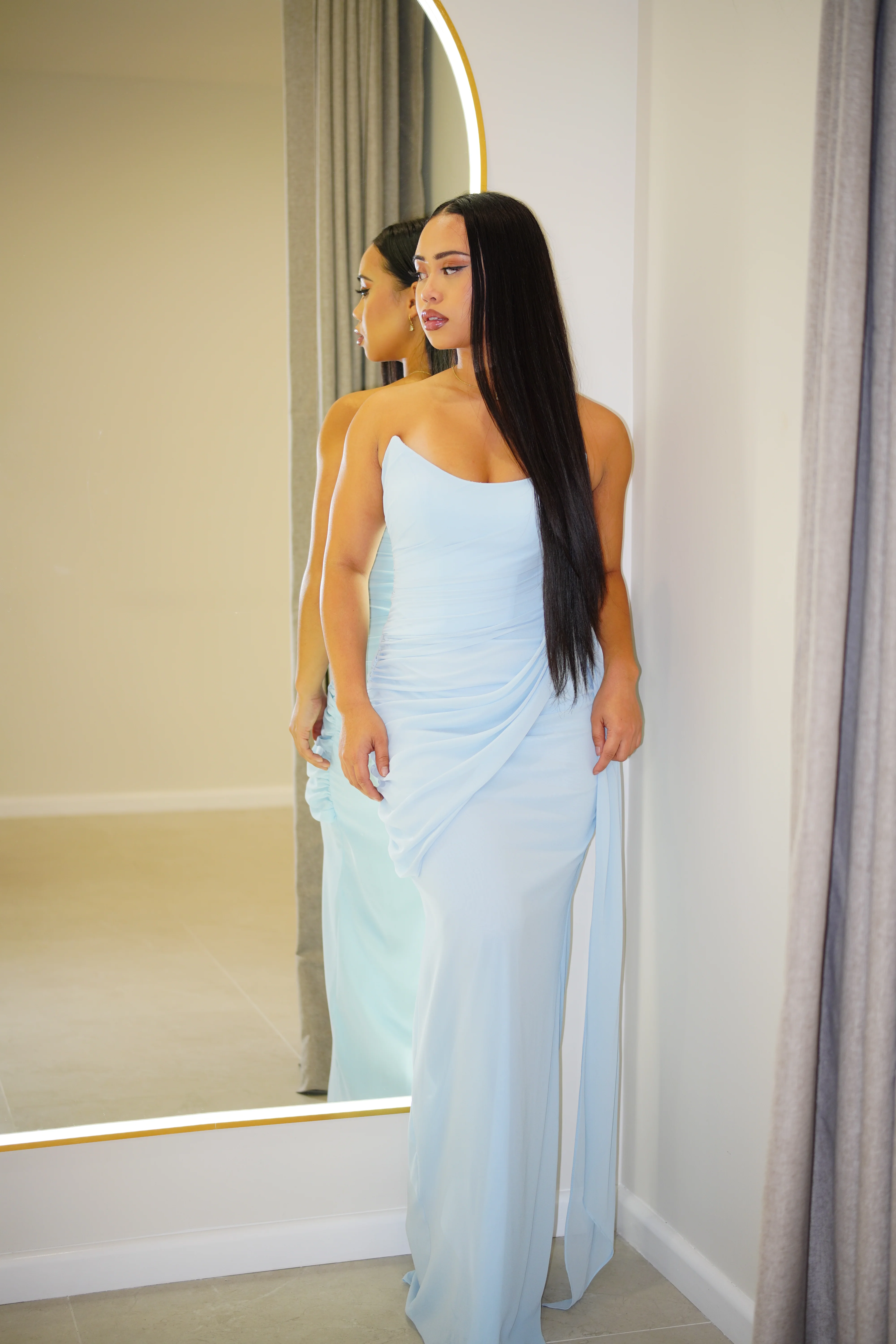 Make an unforgettable entrance in this romantic chiffon gown, designed with a sleek strapless neckline and soft, body-sculpting draping. The ruched detailing contours the waist while the cascading side sash adds movement and modern elegance. Crafted from lightweight chiffon, this silhouette feels airy yet sculpted, making it perfect for bridesmaids, spring formals, galas, and special celebrations. A lace-up back ensures an adjustable and secure fit.